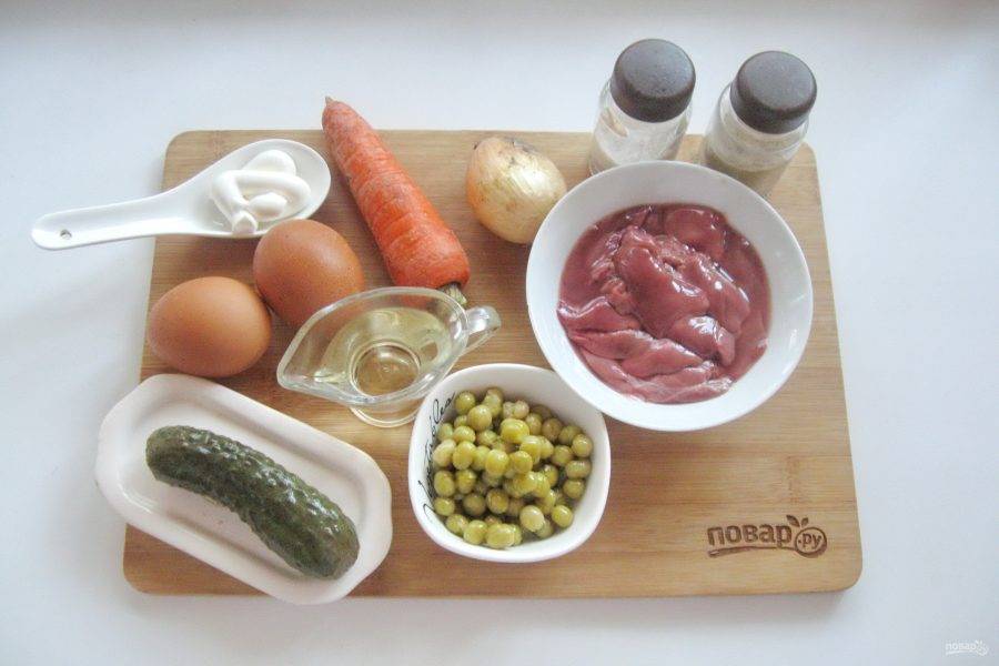 Соберите салат с помощью кольца или просто выложите слоями на тарелку. Куриную печень поперчите по вкусу и смешайте с небольшим количеством майонеза. Половину печени выложите первым слоем салата. Второй слой — тертая морковь. Третий слой — тертые белки. Четвертый — жареный лук. Пятый слой — тертый соленый огурец. Шестой — вторая половина куриной печени. Седьмой слой — зеленый горошек. Верх салата посыпьте желтком. Слой моркови, белка и горошка покройте майонезом.
