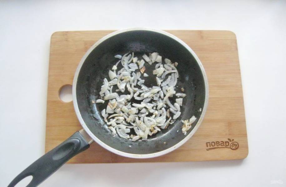 Репчатый лук очистите и мелко нарежьте. Обжарьте в сковороде на подсолнечном масле.