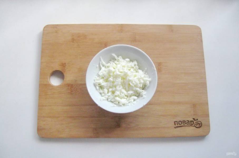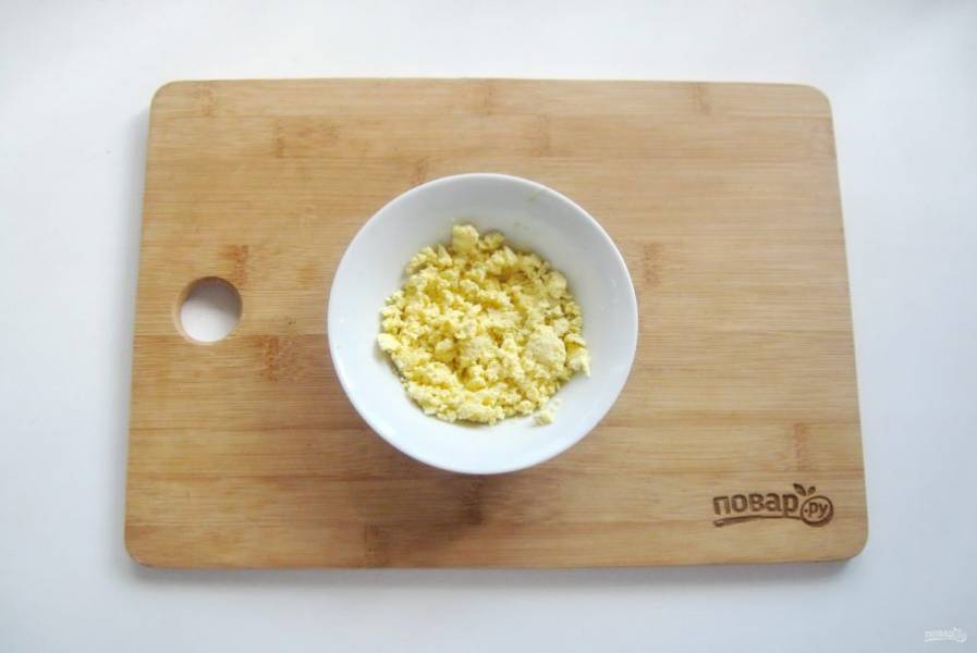 Яйца сварите вкрутую, охладите и очистите. Белки отделите от желтков и натрите на терке.