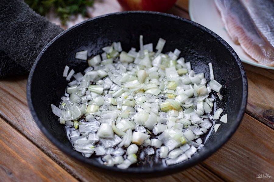 В чистой сковороде разогрейте растительное масло и выложите измельченный лук, обжаривайте его на небольшом огне до прозрачности, затем выложите в отдельную тарелку охлаждаться.