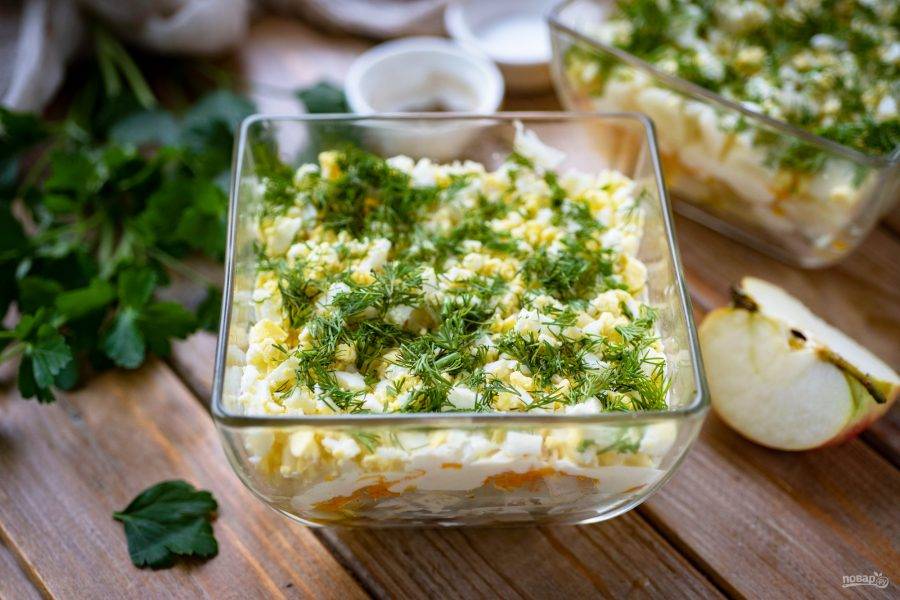 Поверх яичного слоя выложите мелко порубленный свежий укроп. Отправьте миску с готовым салатиком на час в холодильник, а затем подавайте к столу. Приятного аппетита!