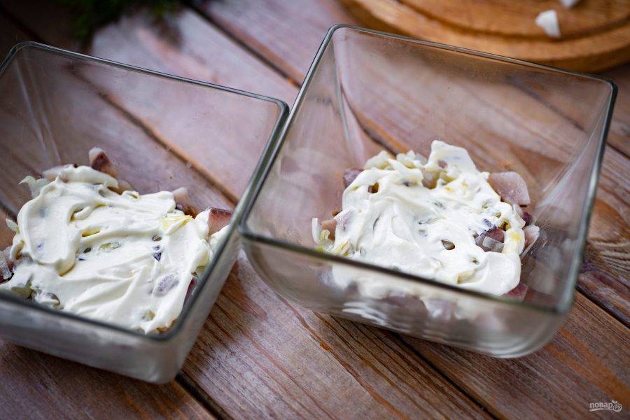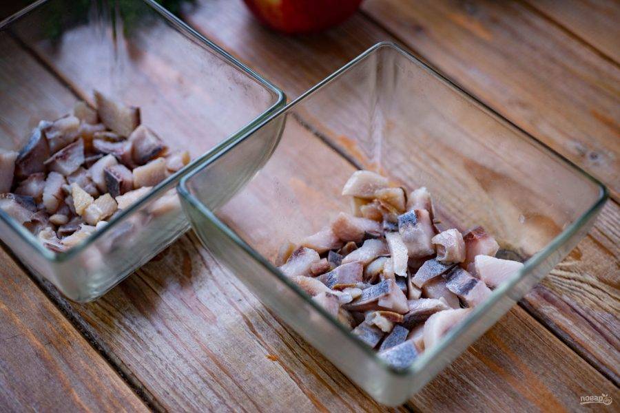 У меня два салатника, поэтому я все ингредиенты буду равномерно распределять между ними. Нарежьте филе сельди небольшими кубиками и выложите слоем на дно салатника.