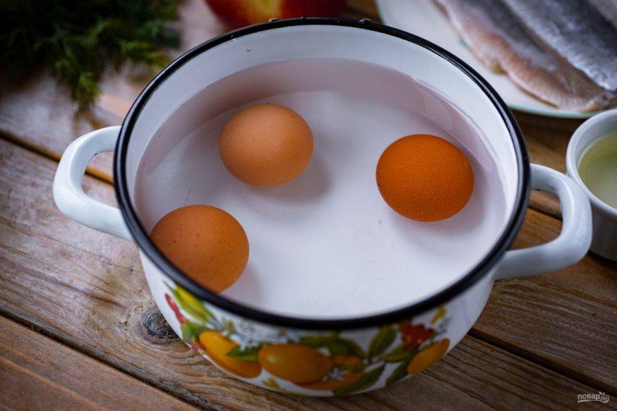 Отварите яйца до состояния "вкрутую" — 10 минут с момента закипания жидкости.