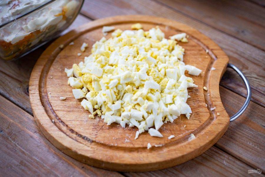 Отварные яйца почистите от скорлупы и мелко порубите ножом. Выложите порубленные яйца слоем.