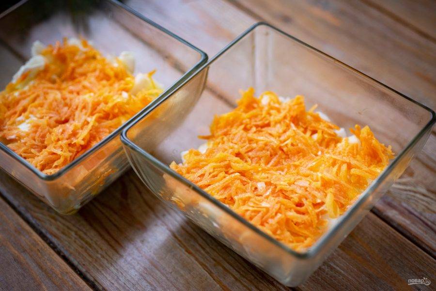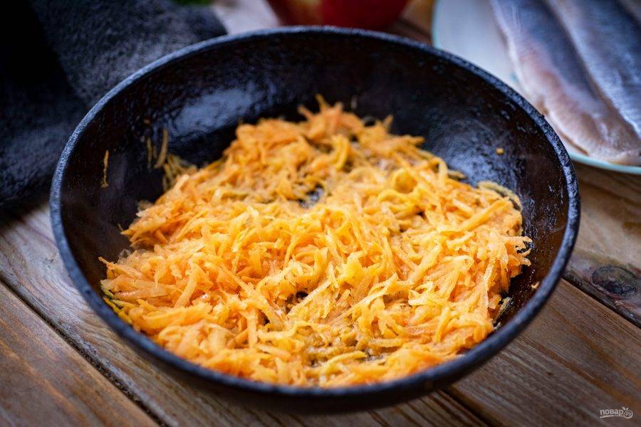 В сковороде разогрейте растительное масло и обжарьте до мягкости на небольшом огне морковь. Затем выложите ее в отдельную тарелку охлаждаться.