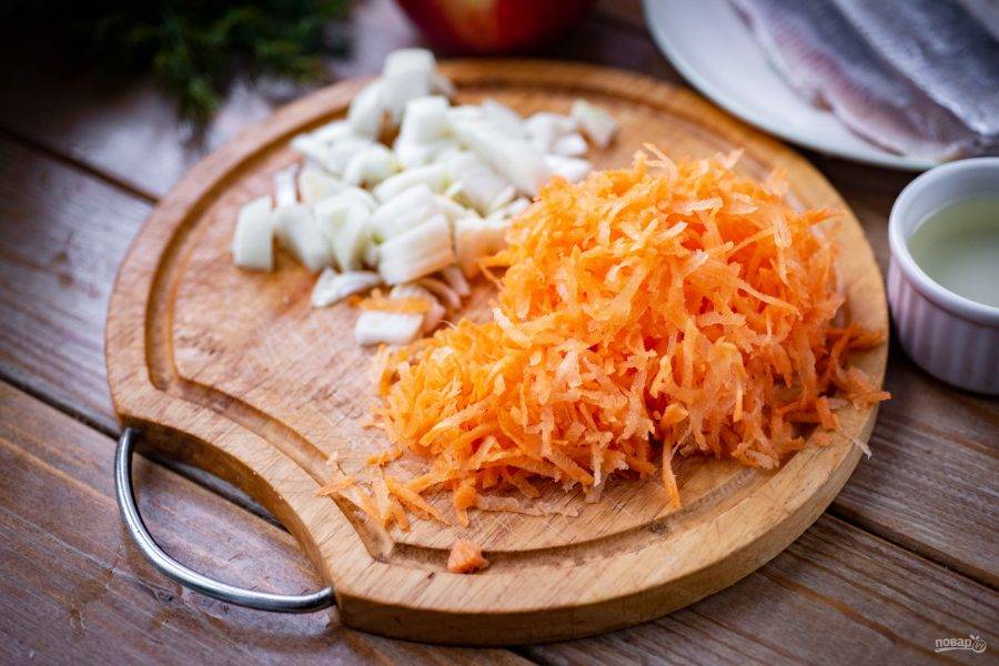 Нашинкуйте лук мелкими кубиками, морковь натрите на крупную терку.