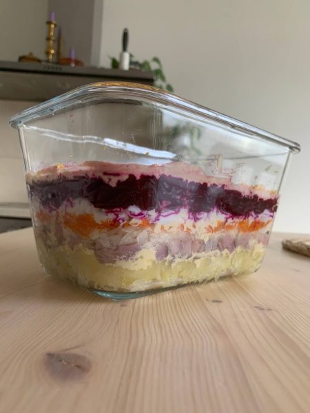 Салат популярен на каждом празднике благодаря доступности ингредиентов и сбалансированному вкусу всех продуктов. Готовится салат слоями и выглядит нарядно и празднично.