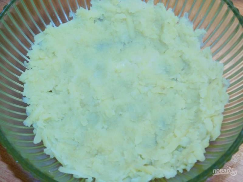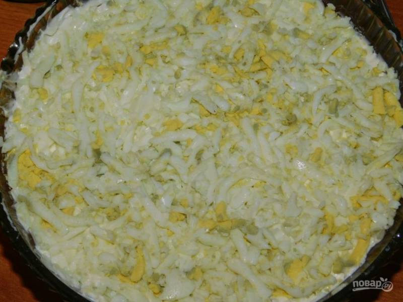 На дно салатника натрите на крупной терке картофель. Этот слой и все последующие смажьте майонезом.