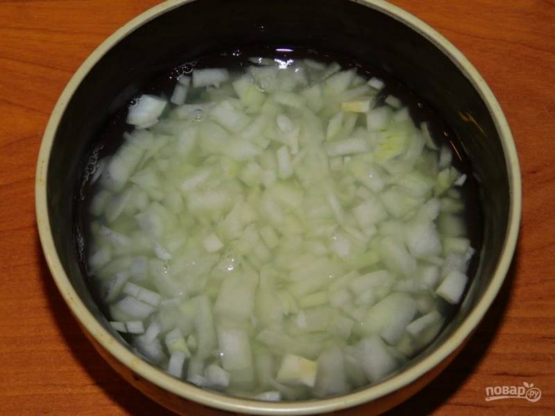 Первым делом мелко нарежьте лук и замаринуйте его в уксусе с водой. Оставьте минут на 15. Затем жидкость слейте.