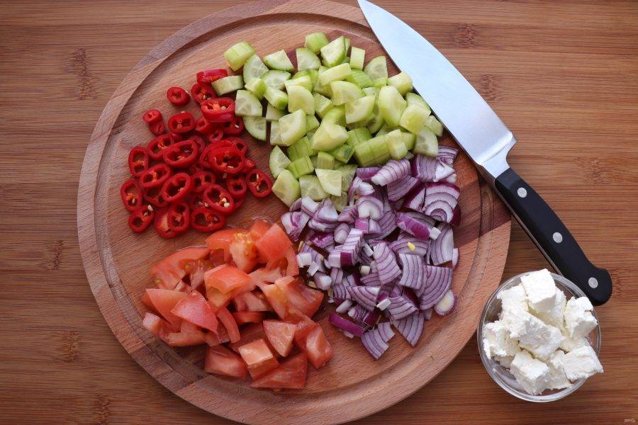 Нарежьте все овощи крупными кусочками. Такими же кусочками нарежьте брынзу.