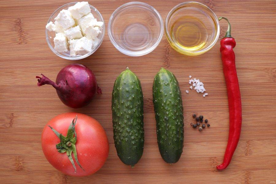 Готовим сербский салат. Набор продуктов для этого салата предельно прост: помидоры, огурцы, лук. Изюминкой такого салата является острый свежий перец и овечья брынза. Очень вкусно и пикантно!