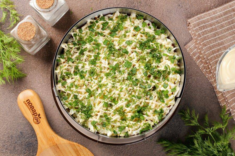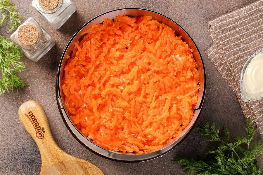 Далее выложите тёртую морковь. Посолите и так же смажьте майонезом.