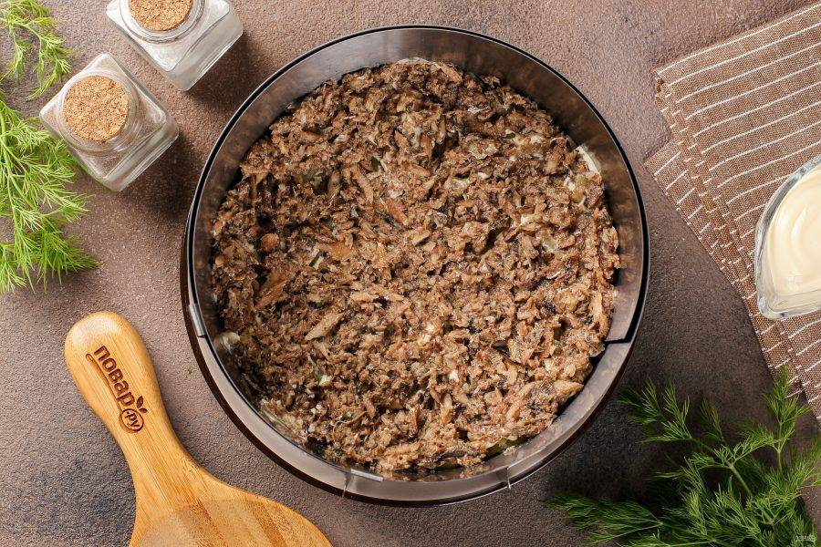 Шпроты разомните вилкой, добавив небольшое количество масла из банки для сочности, и выложите вторым слоем.