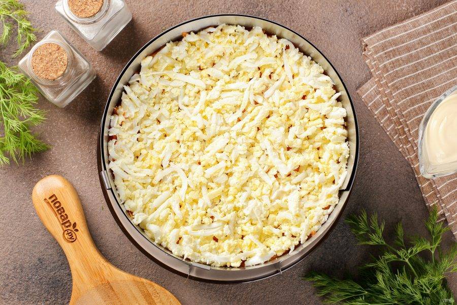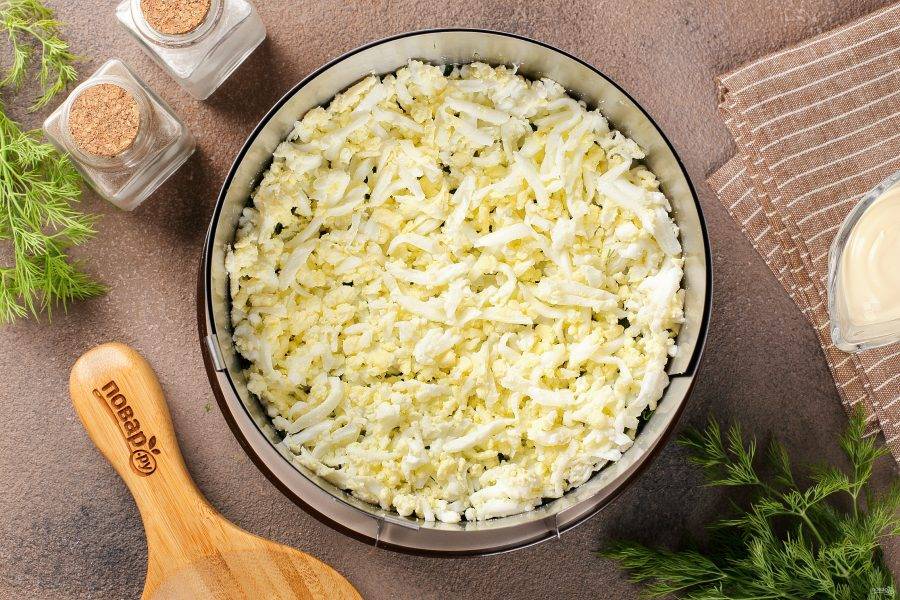 Варёные яйца натрите на крупной тёрке. Половину яиц выложите следующим слоем. Посолите и смажьте майонезом.