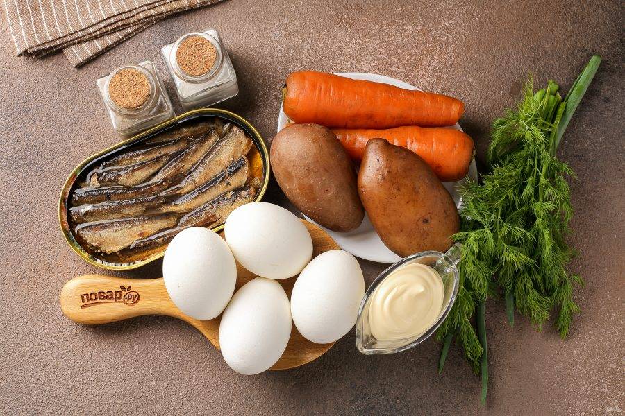 Подготовьте все ингредиенты. Яйца и овощи заранее отварите и дайте остыть.