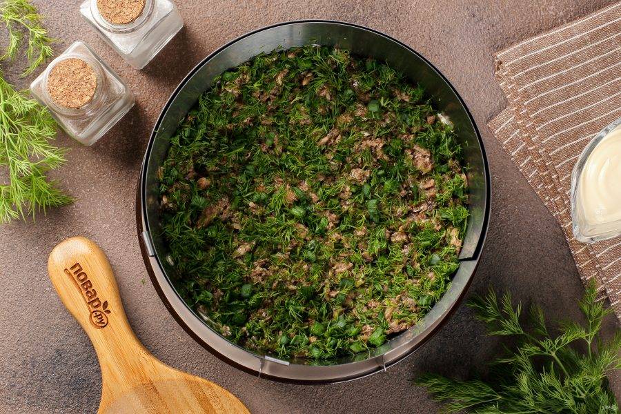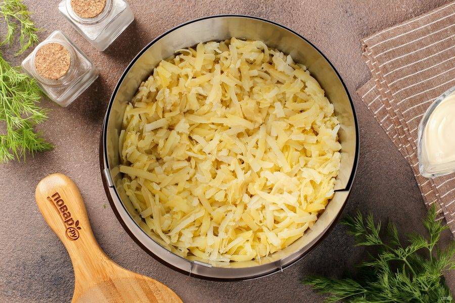 Я буду выкладывать салат при помощи кулинарного кольца, но можно просто выложить его слоями в любой глубокий салатник. Первым слоем выложите тёртый картофель. Посолите, поперчите и смажьте слой майонезом.
