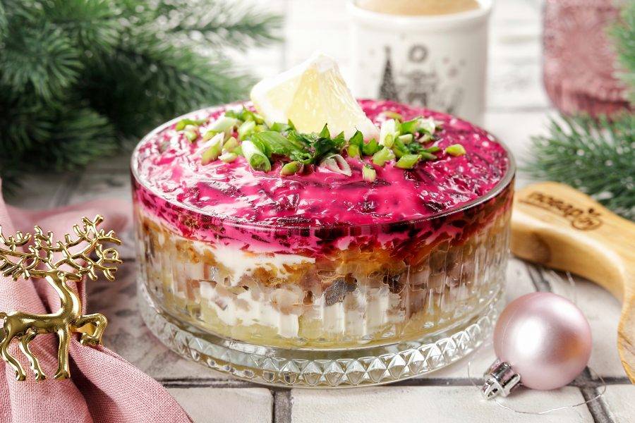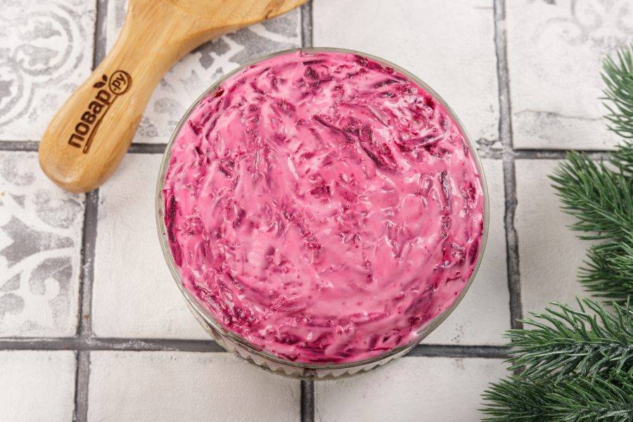Последним слоем распределите свеклу. Посолите и смажьте майонезом. Салат Шуба готов. Дайте ему время, чтобы салат пропитался.