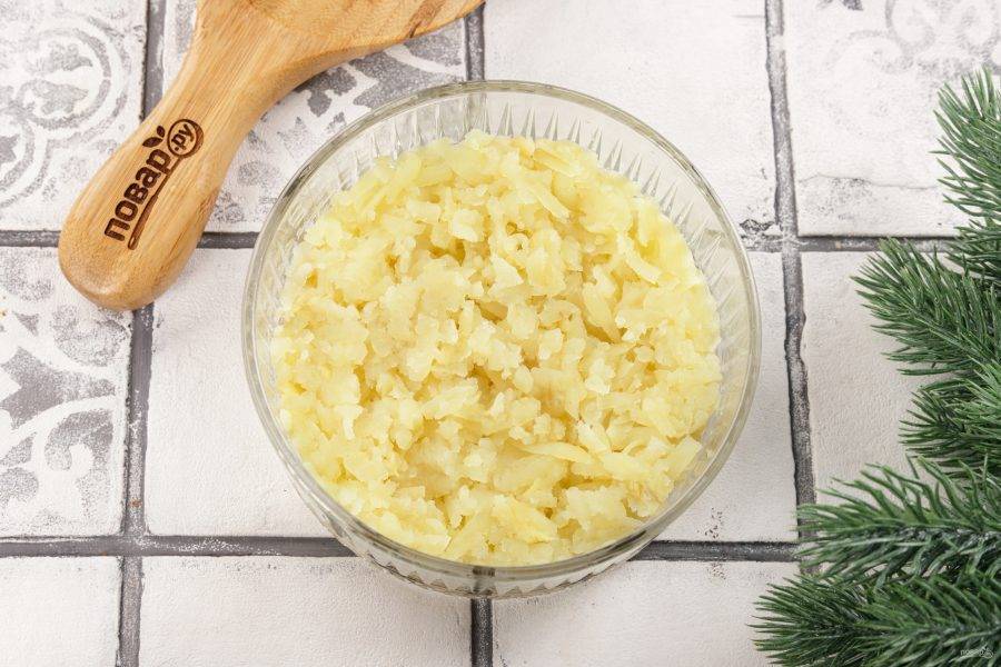 Возьмите посуду, в которой будете подавать салат. Первым слоем выложите картофель, разровняйте, посолите и смажьте майонезом.