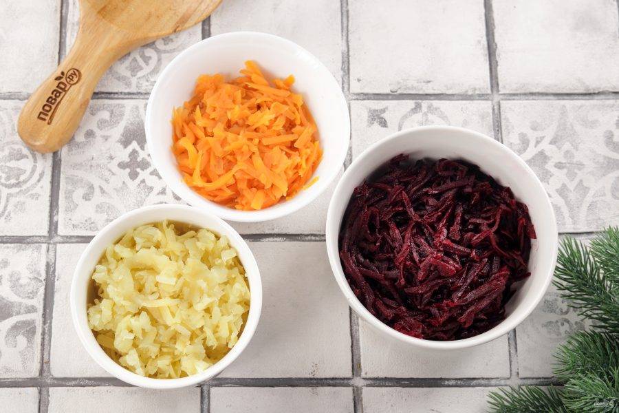 Картофель, морковь и свеклу натрите на тёрке с крупными отверстиями.