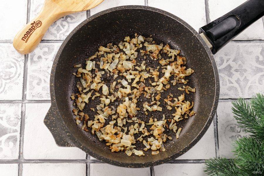 Лук нарежьте кубиками и обжарьте до золотистого цвета. Посолите по вкусу.