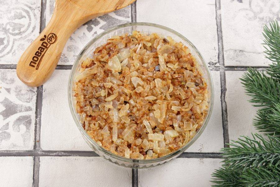 Сверху равномерно распределите жареный лук. Смажьте слой майонезом.