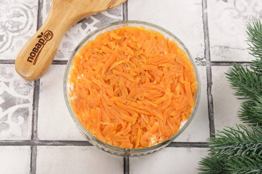 Далее выложите морковь. Посолите и смажьте морковь майонезом.