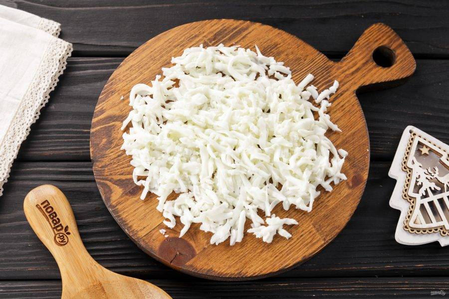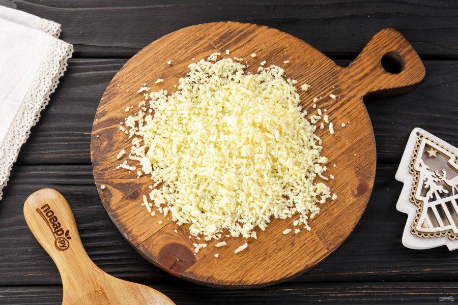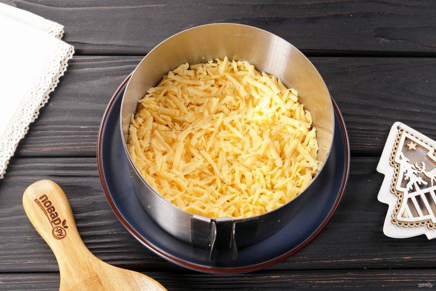 Далее выложите тёртый сыр. Смажьте сыр майонезом.