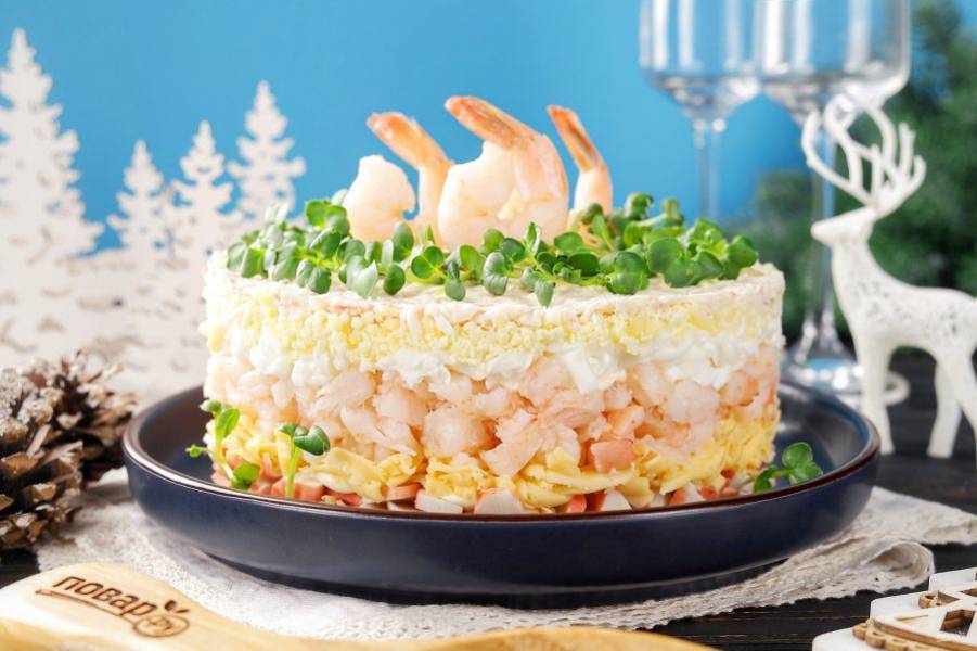 Вкусный и эффектный салат, который оценят все любители морепродуктов. Приготовить салат слоёный с креветками можно к любому праздничному столу.