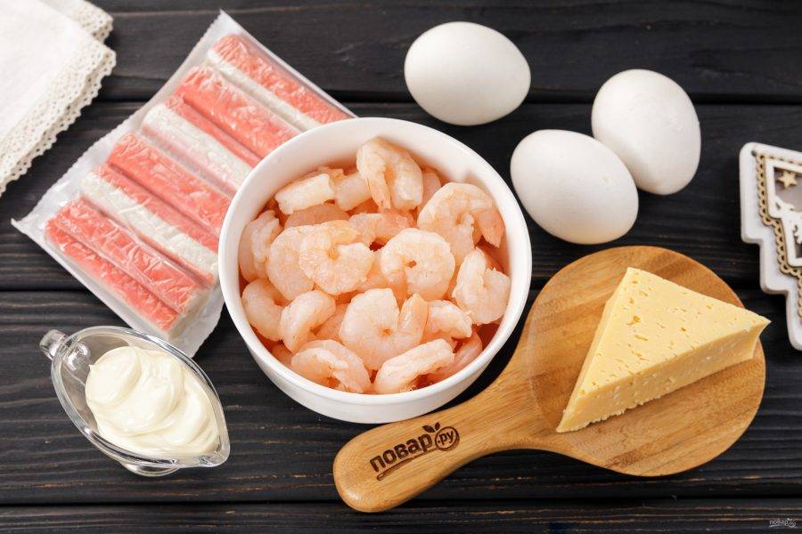 Подготовьте все ингредиенты по списку. Креветки я отварила заранее в подсоленной воде, остудите их и очистите. Креветки можете использовать любые — крупные или мелкие. Чистый вес очищенных креветок должен быть не менее 200 грамм, поэтому если у вас креветки с головой и панцирем, берите их с запасом. Несколько целых креветок можно оставить для украшения салата. Яйца так же отварите заранее и дайте остыть.