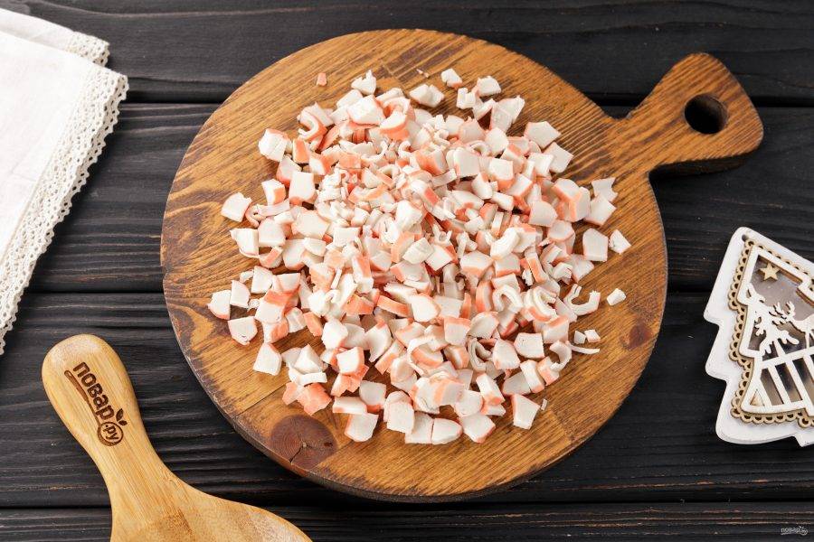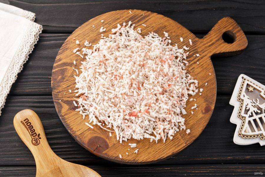 Немного крабовых палочек (2-3 штуки) натрите на тёрке для верхнего слоя. Слой не должен быть слишком толстым, он нужен скорее для красоты, чем для вкуса.