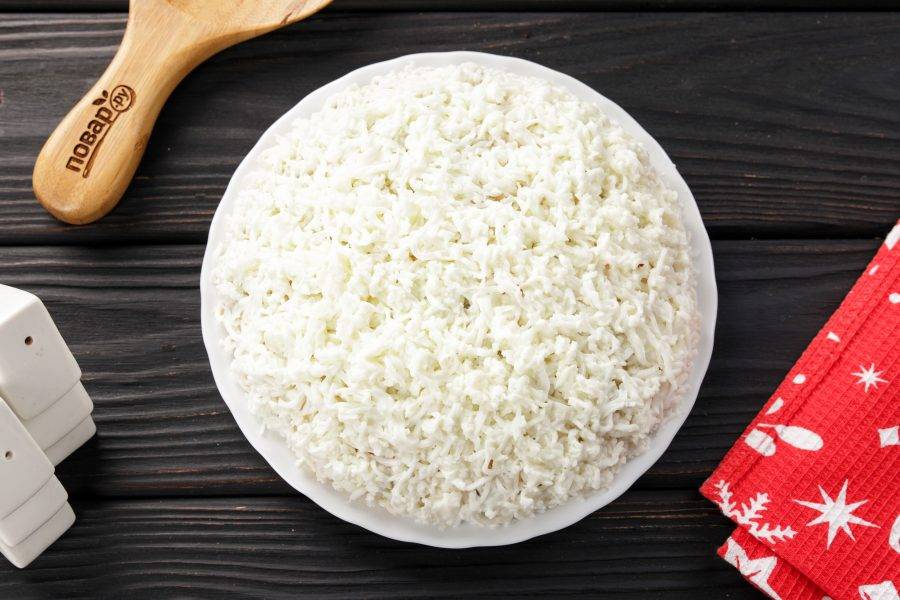 Присыпьте всю поверхность салата натёртым белком, имитируя снег. Тарелку протрите чистой салфеткой от остатков салата.