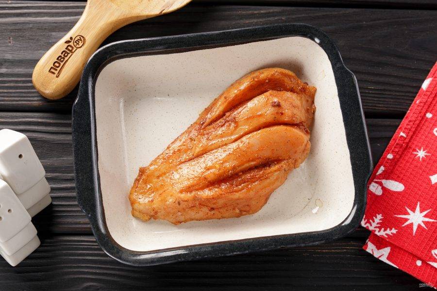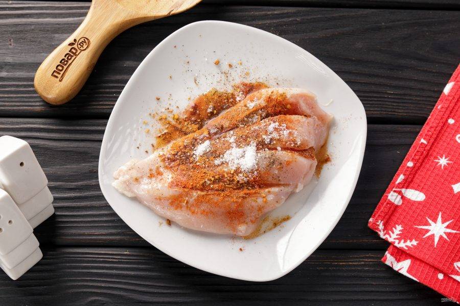 Полейте филе растительным маслом, натрите солью и специями со всех сторон (у меня готовая смесь для курицы и паприка).