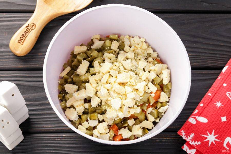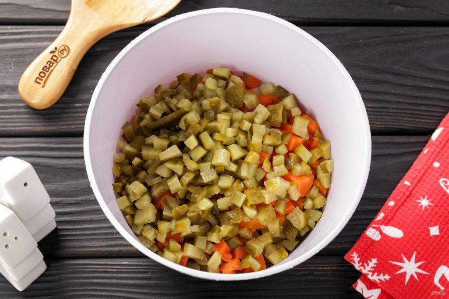 Маринованные огурцы нарежьте примерно такими же кубиками.