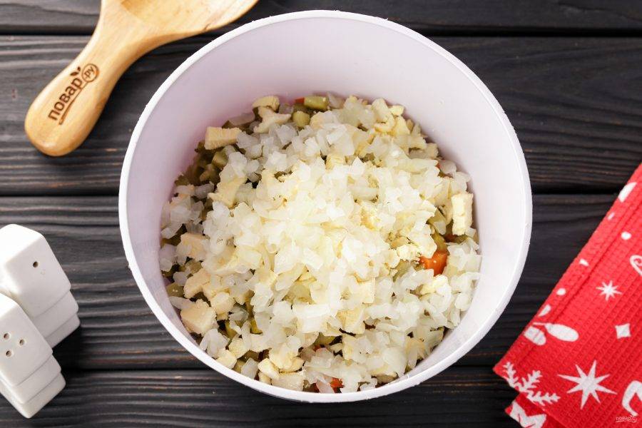Лук нарежьте небольшими кубиками, ошпарьте кипятком, чтобы убрать горечь и отправьте в миску к остальным ингредиентам.