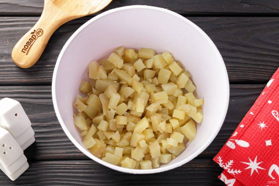 Картофель нарежьте небольшими кубиками, переложите в глубокую миску.