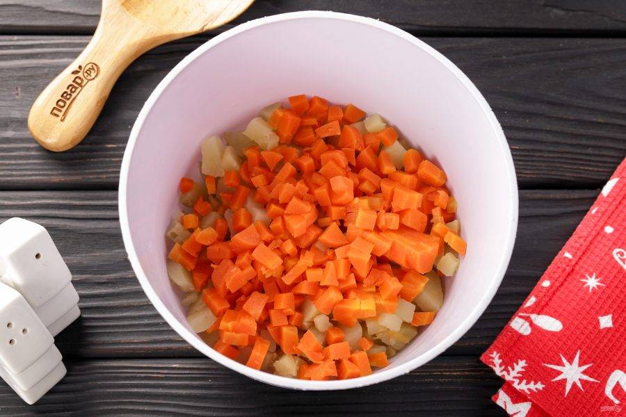 Добавьте нарезанную кубиками морковь, не забудьте из ломтика одной морковки вырезать носик. По желанию можно вырезать дополнительно шляпку.