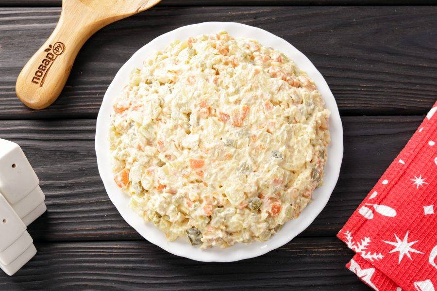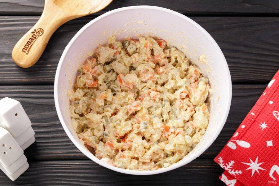 Добавьте майонез, посолите, поперчите и перемешайте.