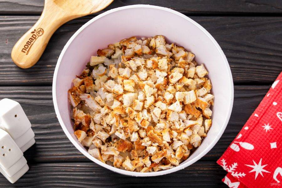Остывшее куриное филе измельчите и переложите в миску к салату.