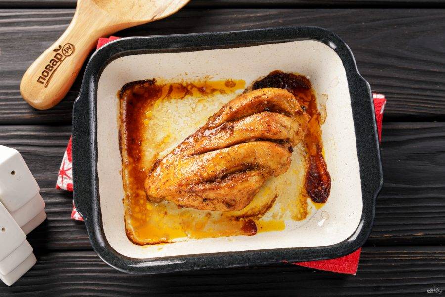 Переложите филе в форму для запекания. Поставьте в разогретую до 200 градусов духовку и запекайте 25 минут.