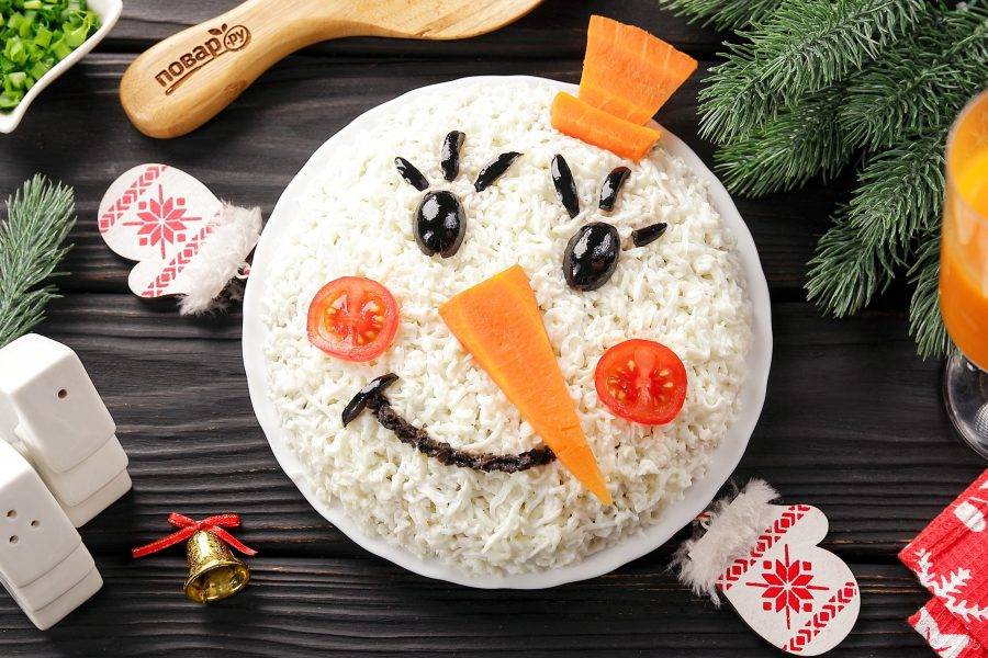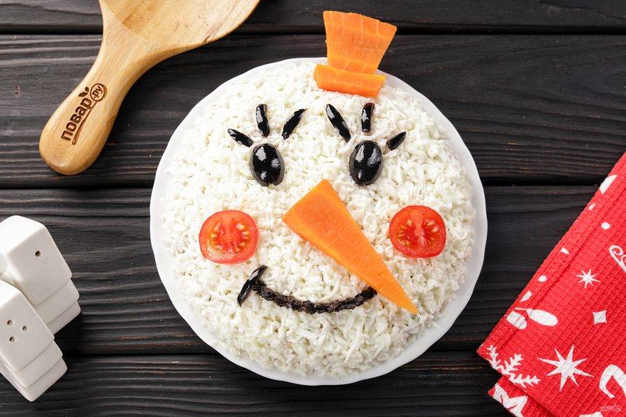 Салат «Снеговик» готов. Подавайте на праздничный стол в качестве холодной закуски. Приятного аппетита!