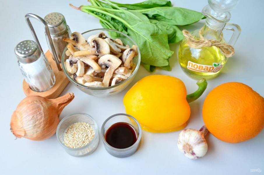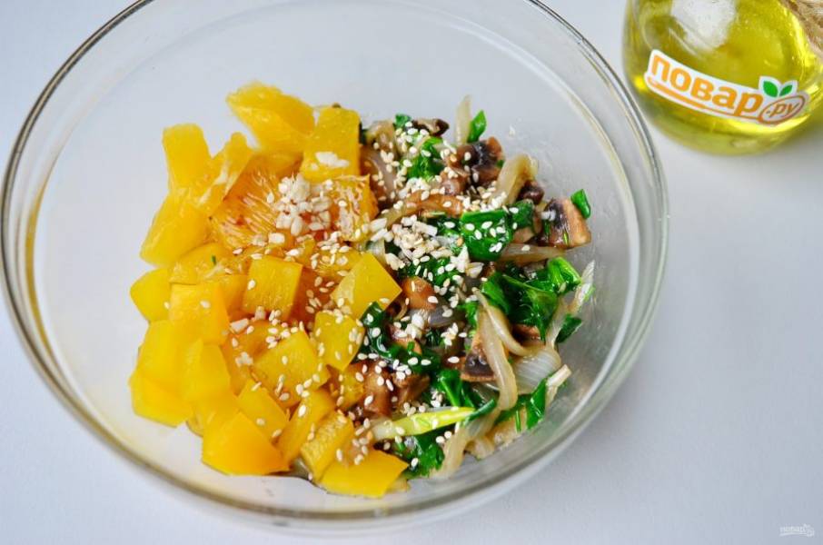 Соедините остывшие грибы и шпинат с перцем сладким, апельсинами. Добавьте соевый соус, чеснок, перец черный, кунжут. Часть кунжута оставьте для украшения салата. Перемешайте хорошо и дайте настояться минут 10, пропитаться. Соль использовать по вкусу, я не добавляла.