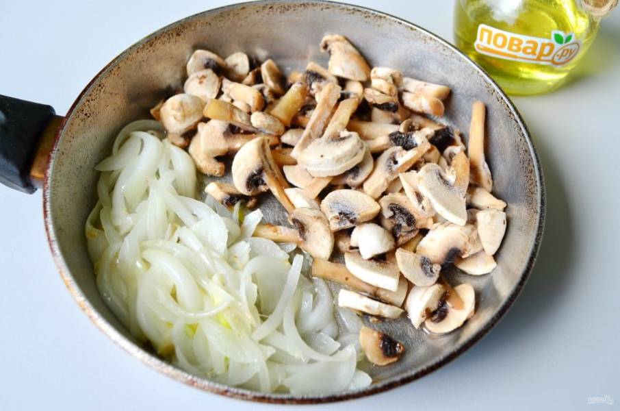 Очистите луковицу и порежьте полукольцами. Обжарьте на растительном масле до мягкости. Грибы подойдут как свежие, так и замороженные, порезанные пластинками. Добавьте грибы к луку и доведите все до готовности.