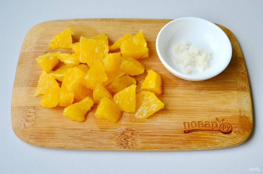 Очистите чеснок, мелко порубите ножом или пропустите через пресс. С апельсина снимите кожуру, удалите белые перепонки, порежьте каждую дольку на 3-4 части. Сладкий перец очистите от семян и порежьте такими же кусочками по размеру.