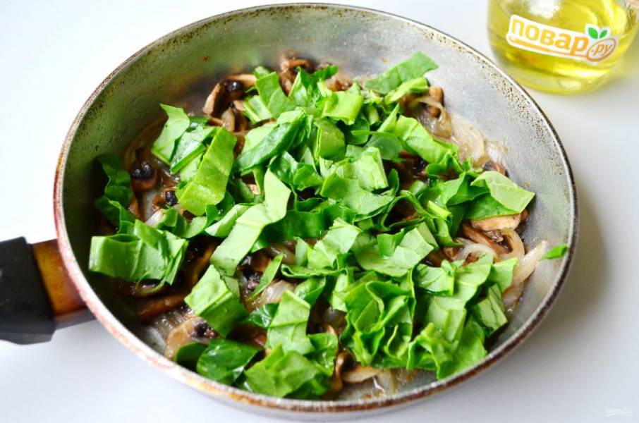 Шпинат вымойте, обсушите, оборвите листочки и порежьте их не очень крупно. За минуту до готовности грибов добавьте шпинат, чтобы он немного привял. Снимите с огня и остудите.