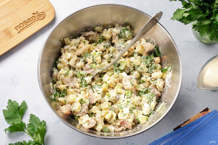 Заправьте салат небольшим количеством майонеза и перемешайте. Можно добавить молотый перец. Соль я не добавляю, но вы ориентируйтесь на свой вкус.