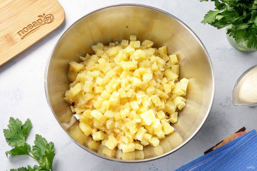 Подготовьте все ингредиенты по списку. Картофель и яйца рекомендую отварить заранее и дать им остыть.