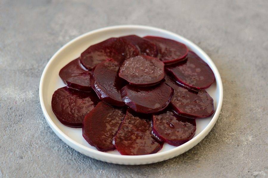 Свеклу очистите от кожуры, нарежьте кружочками. Выложите в один слой на тарелку.