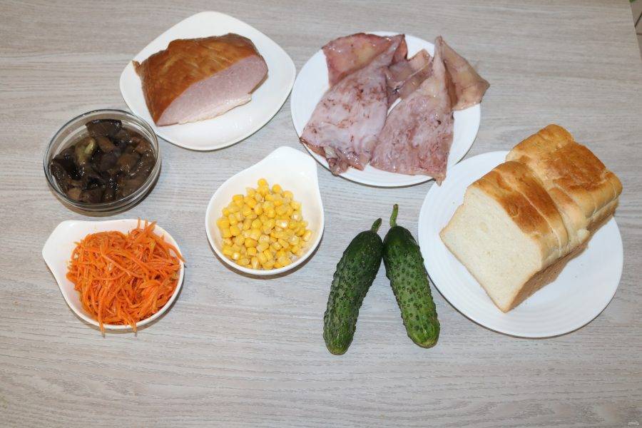 Кальмар отварите в слегка подсоленной воде в течение 3-4 минут, остудите в холодной воде, почистите, нарежьте соломкой. Огурец помойте, натрите на тёрке по-корейски. Ветчину нарежьте соломкой.