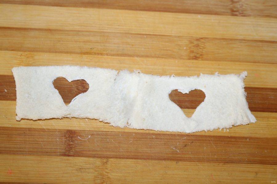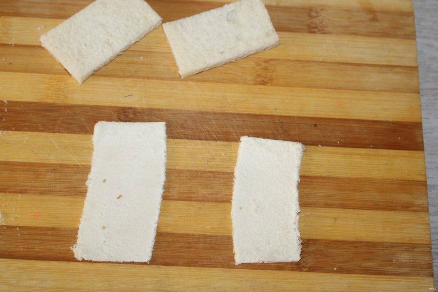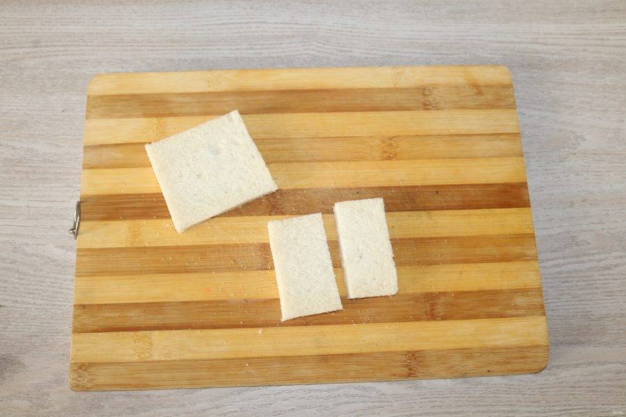 Возьмите хлеб для тостов, срежьте корочки, разрежьте кусочек пополам.