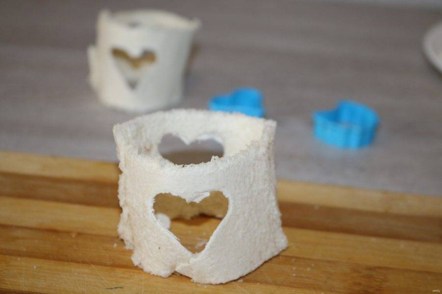 Соедините два кусочка хлеба при помощи воды (склейте их). Формочкой вырежьте узоры.
